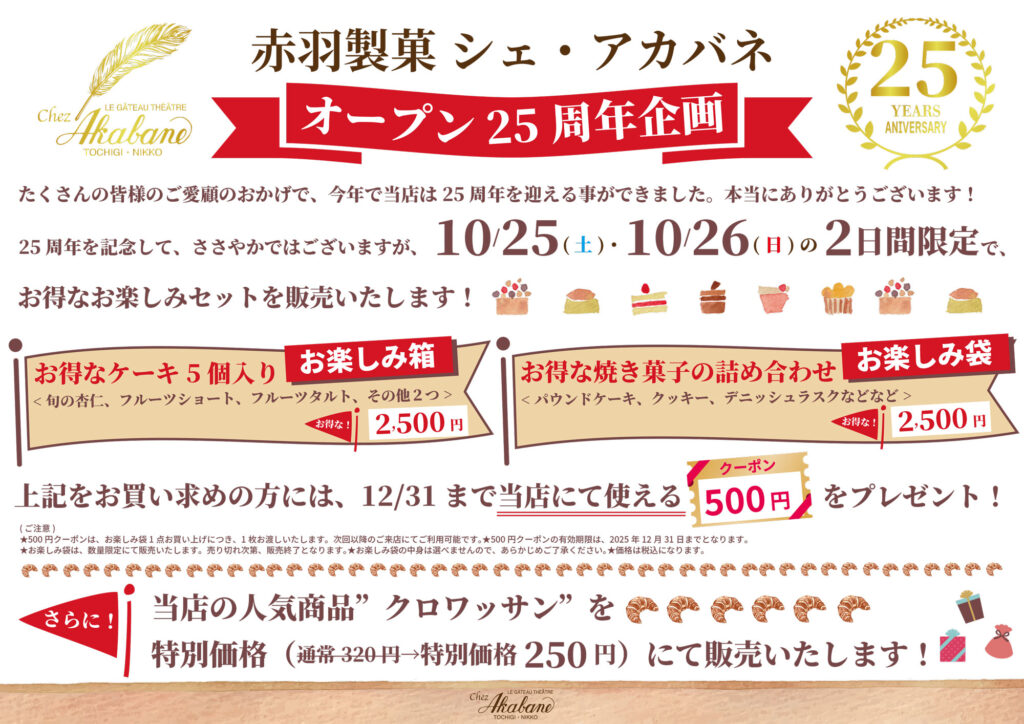 25周年を記念して、ささやかではございますが、10/25(土)・10/26(日)の2日間限定で、お得なお楽しみセットを販売いたします!
