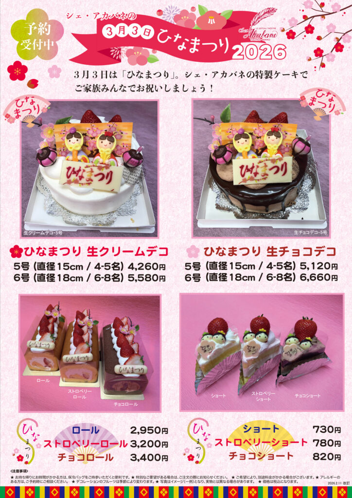 3月3日はひなまつり。シェ・アカバネの特製デコレーションケーキで、ご家族みんなでお祝いしましょう!