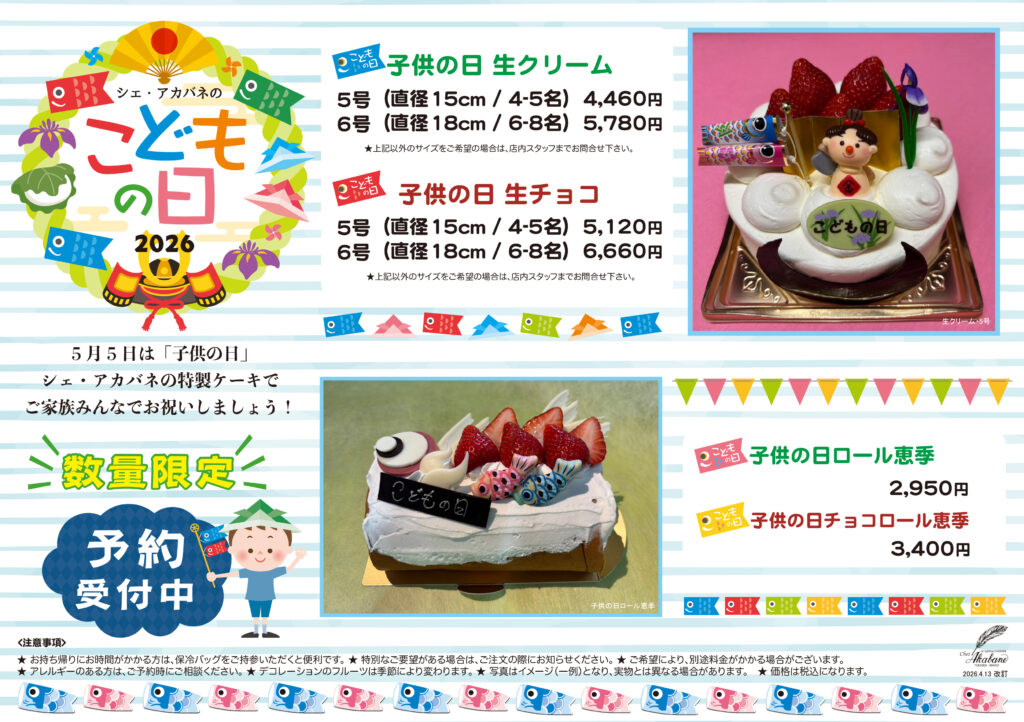 5月5日は子供の日。シェ・アカバネの特製デコレーションケーキで、ご家族みんなでお祝いしましょう!
