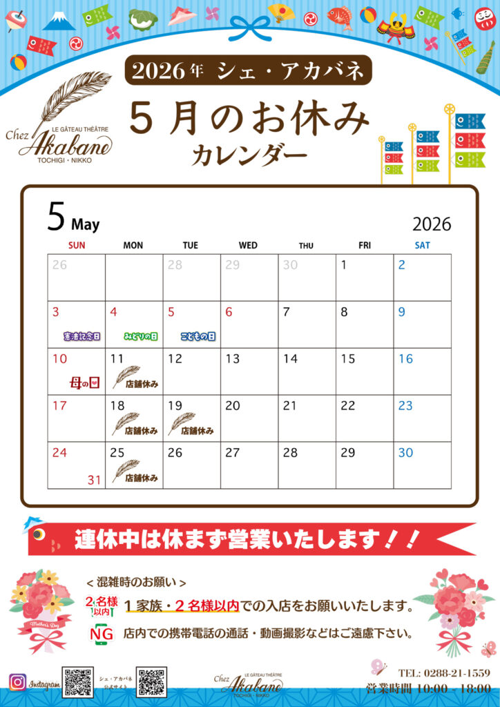 2026年5月のお休み予定になりますので、ご確認の上ご来店ください。